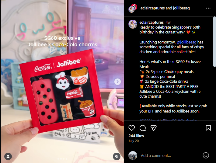 Offering something unique, KFC's cat keychains and Jollibee’s SG60 charms spread fast on Instagram and TikTok. Fans created the content, giving both brands free visibility.