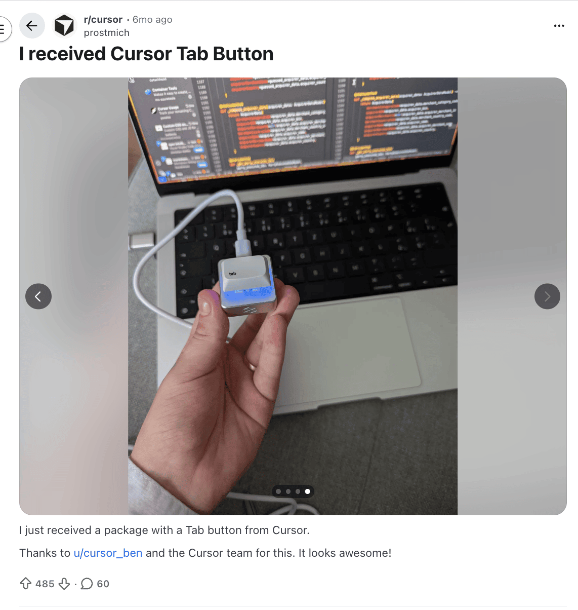 A developer on Reddit shared their surprise moment of receiving the tab key button from Cursor on the mail and wired it up to their computer to show how the Tab Key works while there is a code running in the background. Image Source: Reddit