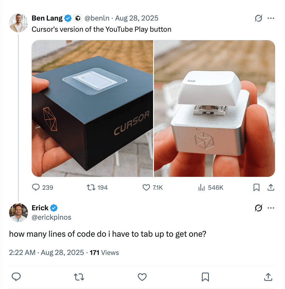 That's what, Cursor, a code editor that uses intelligence to help people who write software succeeded. It gives them ideas to make their work better. Cursor found that a small action can make a difference: pressing Tab to accept an AI code suggestion. Of just tracking this as a statistic or making a badge, the company made it into a physical object. They sent a Tab key to developers who used this feature the most.