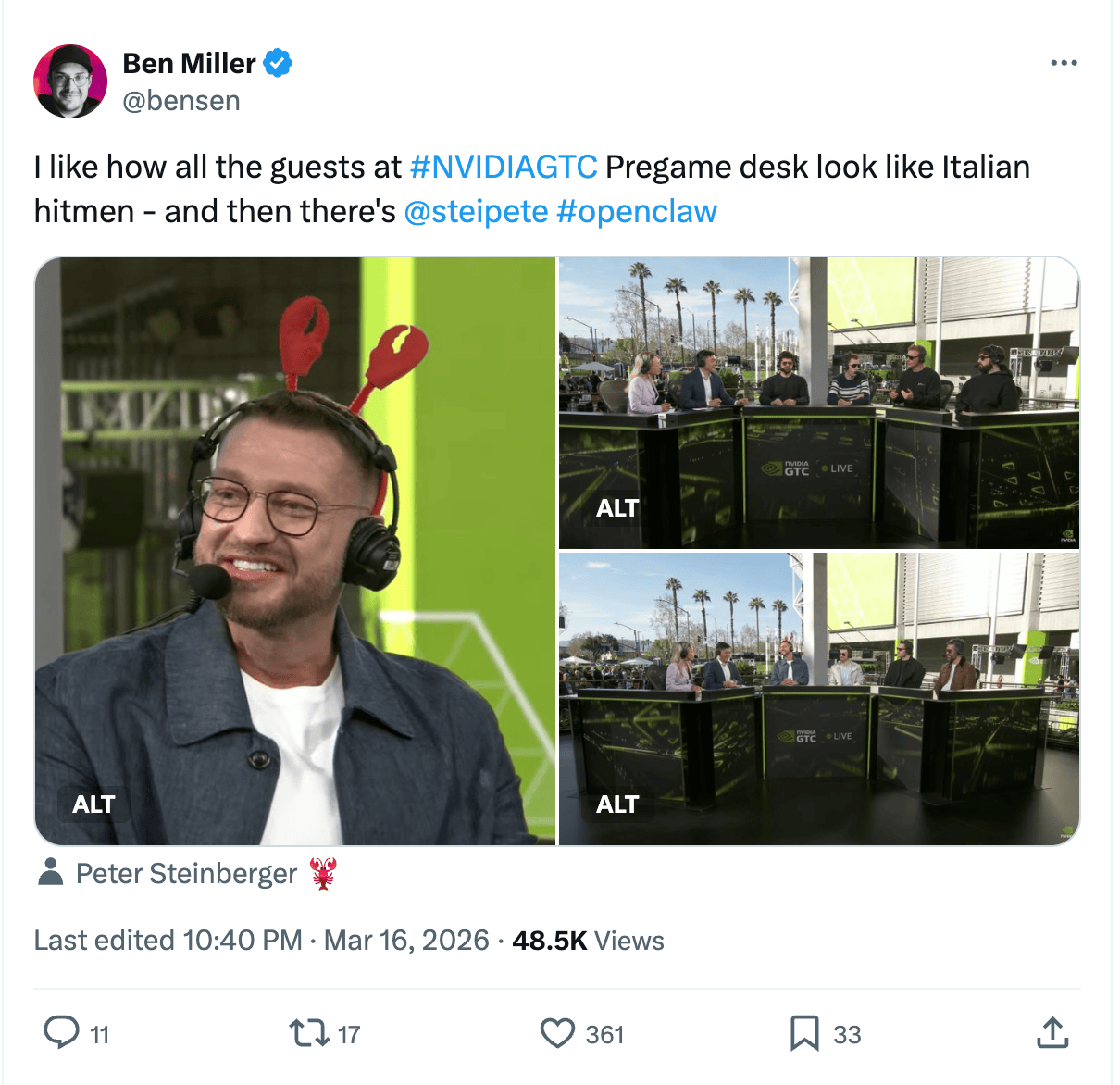 OpenClaw Founder, Peter Steinberger flaunting his lobster headbands at Nvidia GTC 2026 that stood out from everyone else got the conversation running because it looked silly enough for viewers to get curious. Source: x
