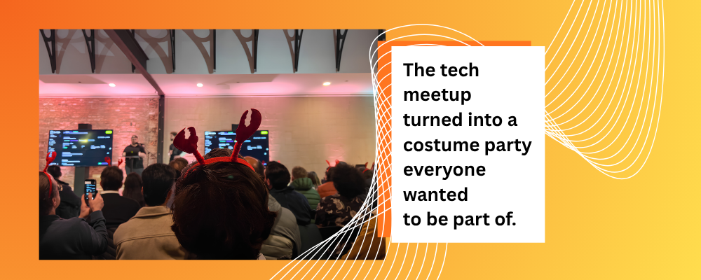 700 people wearing the same absurd thing at the same time createsa curiosity that a single person in a branded t-shirt never can: a moment. When you look at the crowd photos at ClawCon, you don't see a brand but a tribe. That image showed a sea of lobsters is more shareable than any single product shot.