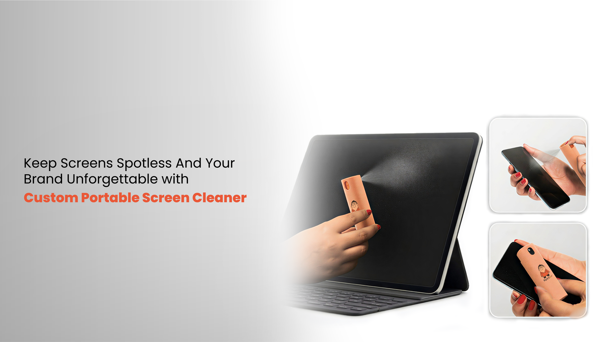 A custom portable screen cleaner is a compact 2-in-1 cleaning device that combines a refillable spray bottle and microfiber wiping surface, designed to clean screens like smartphones, laptops and tablets effectively.